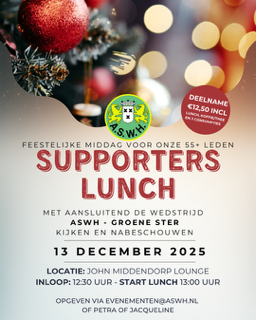 Heb je zin in een gezellige, smakelijke en sfeervolle middag? Dan mag je onze speciale Kerstlunch voor 55+ supporters op zaterdag 13 december absoluut niet missen! Dit is hét moment om samen het jaar af te sluiten, bij te praten met oude bekenden en te genieten van een heerlijke middag vol gezelligheid.
