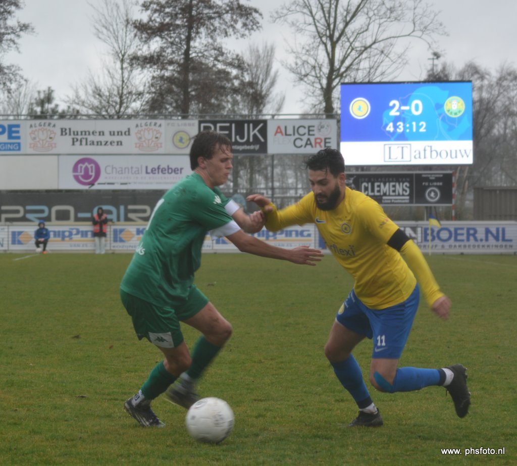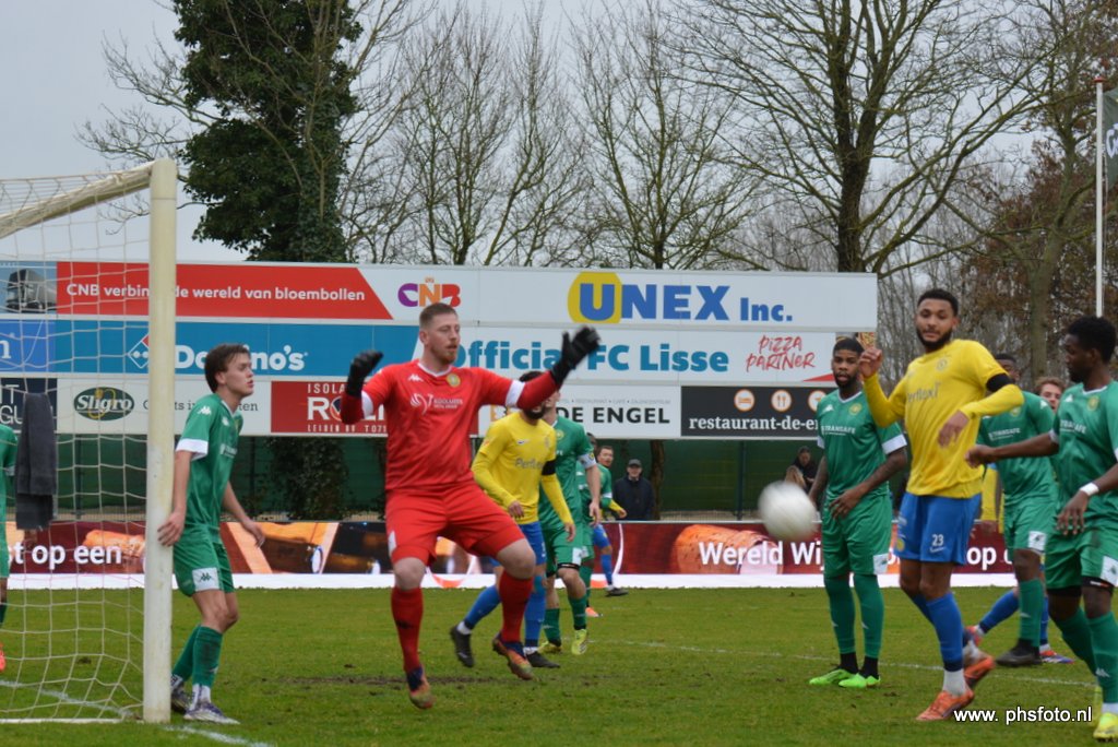 Vanaf de aftrap nam FC Lisse de touwtjes in handen. De thuisploeg is inmiddels verzekerd van deelname aan de nacompetitie om promotie, maar maakt ook kans op het kampioenschap. De gastheren oogden dan ook vastberaden om opnieuw drie punten bij te schrijven. Al vroeg in de wedstrijd mocht het thuispubliek juichen. Jeffrey Verkerk tikte een afstandsschot van Gijs de Bruin uit het doel, maar dat ging ten koste van een hoekschop. De doelman werkte de scherp indraaiende bal weg, maar daardoor kreeg opnieuw Gijs de Bruin een kans. Via een Ambachts been schoot de verdediger van FC Lisse raak: 1-0.