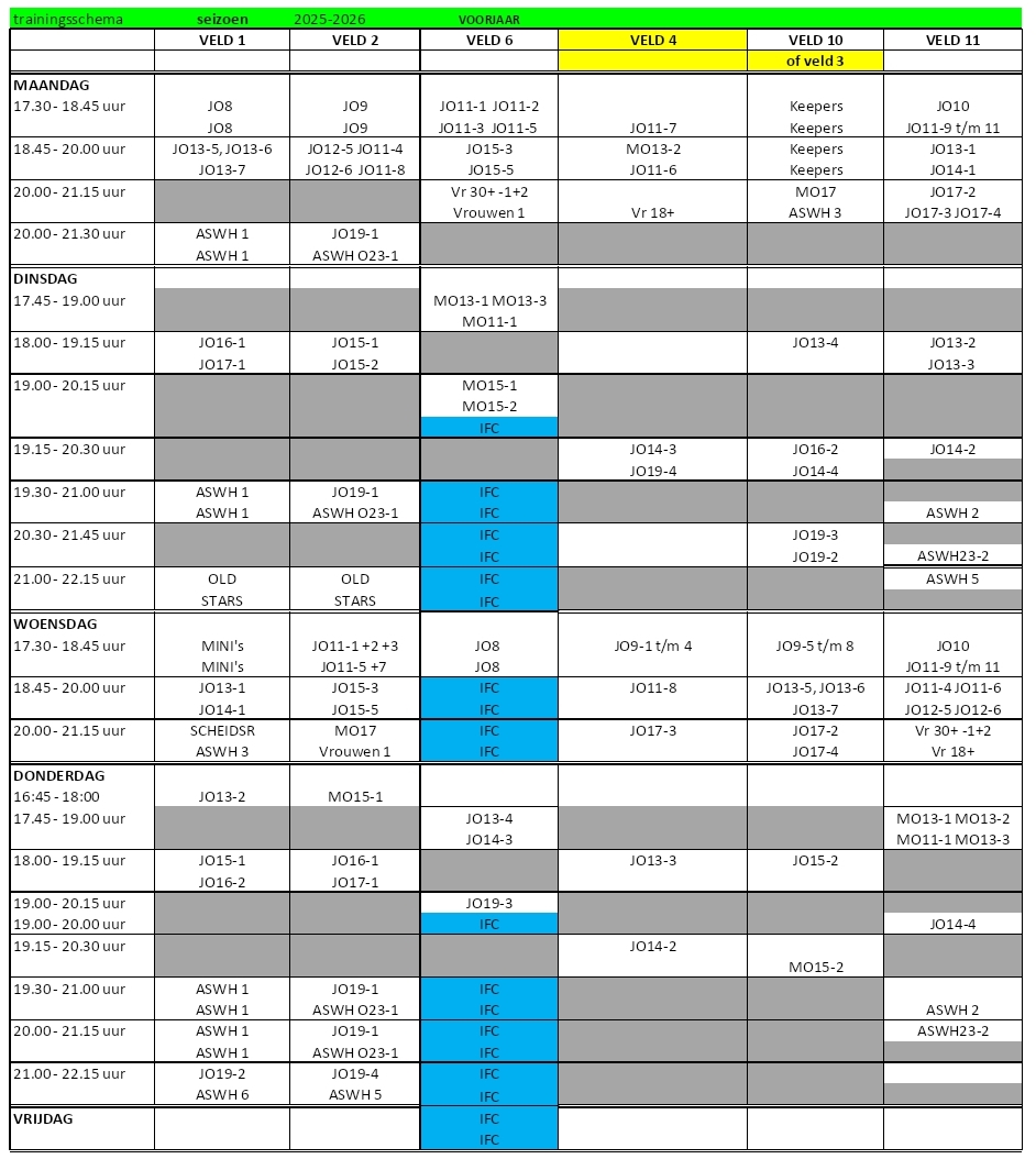 Iedere trainer wordt vriendelijk verzocht dit nieuwe trainingsschem te raadlegen.