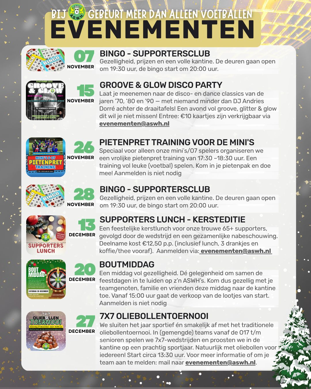 Bij ASWH draait het niet alleen om voetbal, maar ook om samen genieten! De komende periode staat weer vol met leuke activiteiten: van gezellig feesten, Bingo's en gezamenlijke lunchen tot onze echte klassiekers — het Oliebollentoernooi, Boutmiddag en de Wintercup. Mis het niet en beleef samen met teamgenoten, supporters en familie de clubgezelligheid die ASWH zo bijzonder maakt!