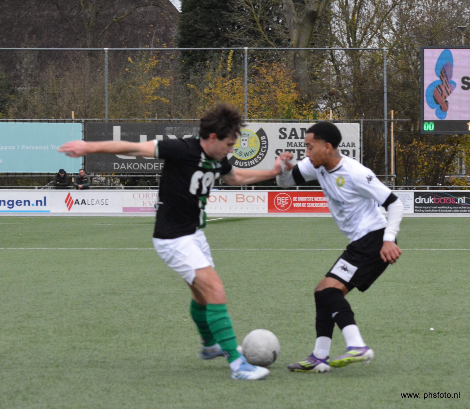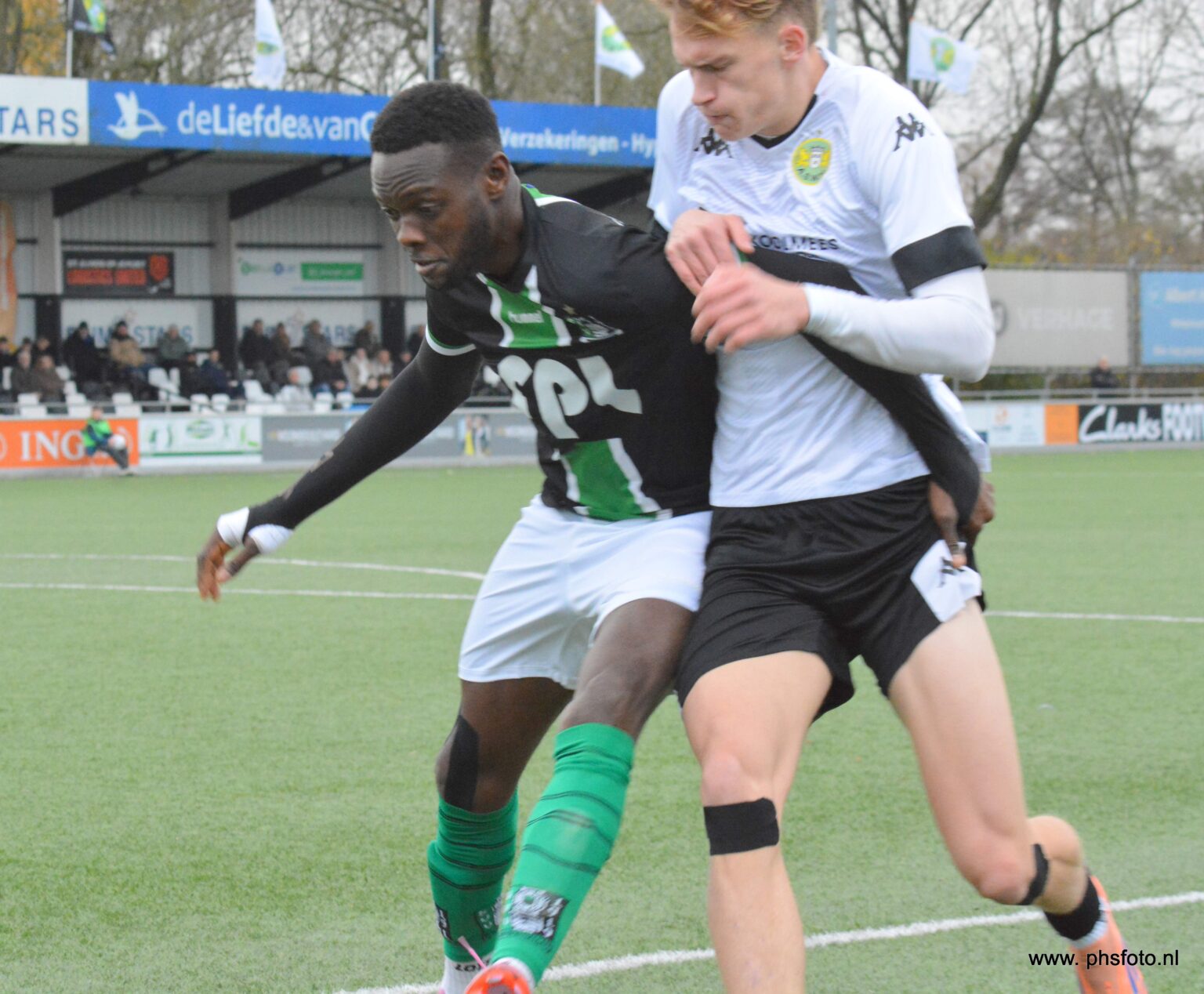 Jay Abbo, die weer alles gaf én scoorde, in duel met de sterke Ghanees Kevin Owusu Amoh van Scheveningen (foto: Philip Schmidt)
