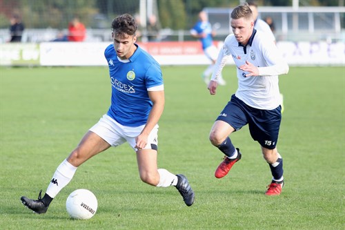 Gilmaro van de Werp probeert aan de zijlijn een aanvaller van Koninklijke HFC af te stoppen