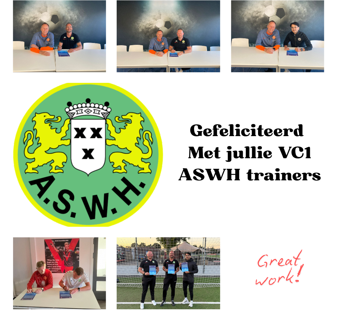 ASWH feliciteert met trots Arjan Boer, Stefan Verbaas, Matthijs Verschoor en Ahmed al Attabi met het behalen van hun VC1-diploma! Deze vier betrokken clubleden hebben zich onlangs officieel gekwalificeerd als trainer en zetten daarmee een mooie stap in hun trainersloopbaan.